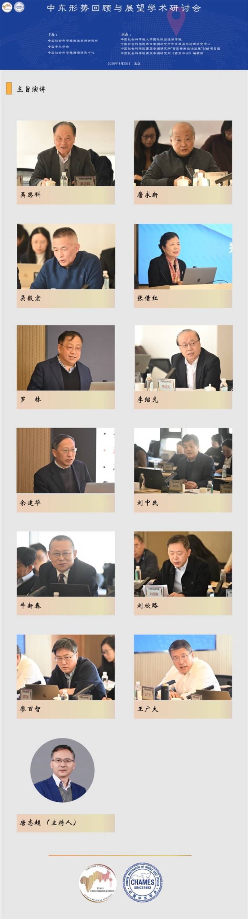 2026123日,中东形势回顾与展望学术研讨会在北京隆重举行。中国前中东问题特使吴思科,中国前驻以色列大使詹永新,中国社会科学院西亚非洲研究所党委书记周工岱,中国社会科学院西亚非洲研究所所长、中国非洲研究院院长叶海林以及来自全国各高校和研究机构的60余位专家出席了会议。中国中东学会会长、中国社会科学院海湾研究中心主任王林聪主持开幕式。